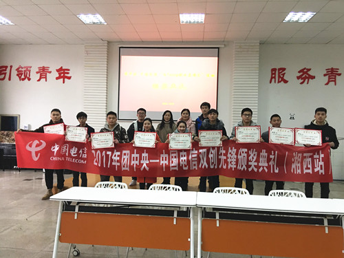 本网讯(通讯员 刘嘉慧 贺思嵘)1月19日,英国威廉希尔唯一官网在砂子坳校区团委青年沙龙室举行了“2017年团中央--中国电信双创先锋”颁奖典礼。校团委张宝娣、吴岳衡老师、电信校园部经理出席本次颁奖典礼,中国电信湘西分公司校园中心总监杜世昌为获奖学生颁奖。