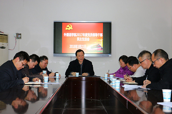 本网讯(外国语学院供稿)为深入学习贯彻党的十九大精神,按照学校党委的相关部署,3月21日下午,外国语学院在院会议室召开了2017年度党员领导干部民主生活会,校长白晋湘、组织部长陆升合以及王伟老师到会指导,会议由院党委书记石红梅主持,院党委领导班子成员、党外人士汤敬安院长列席会议。