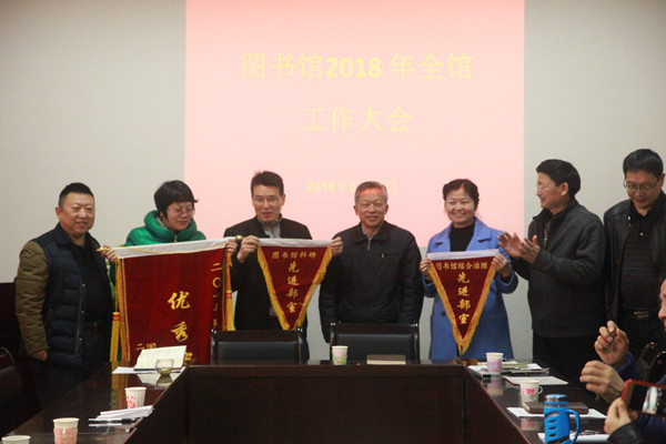 最后,谷遇春宣布了2017年度吉首校区馆获奖部门及图书馆优秀共产党员名单。信息部被评为“综合优秀部室”,技术部被评为“科研先进部室”,大田湾读者服务部被评为“综合治理先进部室”。彭一熳、刘晓凤、卢明芳、余弦、李鸿雁、王灵、刘喜球七位同志被评为图书馆“优秀共产党员”。罗金铭分别为获奖者颁奖。