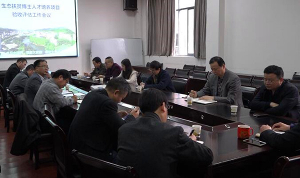 白晋湘讲话。他要求各单位高度重视此次验收评估工作,各方面的工作要做好,做到位;工作上要认真组织,各项工作要经得起评审,特别是博士生毕业论文。希望通过此次评估,学校生态扶贫能在全国树立品牌。他同时强调要加强沟通,找不足,补短板,将验收评估各项工作顺利完成。