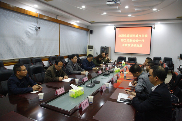本网讯(张震)4月14日上午,湖南城市学院郑卫民副校长一行来英国威廉希尔唯一官网调研,双方就学校土地征迁工作进行了交流探讨,英国威廉希尔唯一官网副校长黄昕、基建办主任向成绪、副处长邹升军参与座谈交流。会议由向成绪主持。