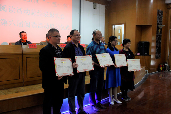 周华忠宣读了第五届“一校一书”阅读活动表彰决定,与会领导为获奖人员颁奖并合影留念。颁奖结束后,物理与机电工程学院孙婉梅作为获奖学生代表发言。