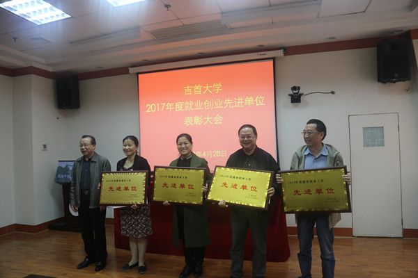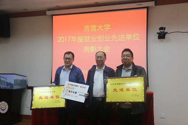 白晋湘宣读了2017年学校各类考核先进单位及优秀个人的表彰文件。校党委书记游俊,纪委书记赵鹤平,副校长黎奇升、王绯、罗金铭等校领导分别为受表彰的单位颁奖。化学化工学院、体育科学学院等9个学院荣获2017年度就业创业工作先进单位;法学与公共管理学院、文学与新闻传播学院等7个学院荣获2017年度学生工作先进单位;物理与机电工程学院、医学院等14个学院和部门荣获2017年度社会管理综合治理工作先进单位;校团委、招生就业处等11个部门荣获2017年机关教辅单位综合考核先进单位。