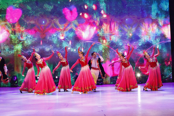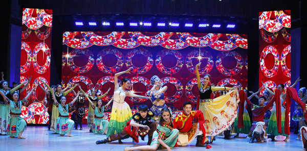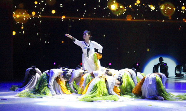 在颁奖过程中,校学生艺术团及音乐舞蹈学院为观众带来了朝鲜族舞蹈《阿里路》、藏族男女群舞《阿噶人》、歌曲演唱《民歌联唱》等6个极具民族风情的节目。