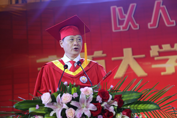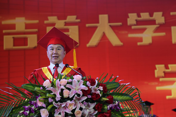 校党委书记游俊,党委副书记、校长白晋湘分别在第一场至第三场和第四场、第五场毕业典礼暨学位授予仪式对2018届毕业生殷切寄语。游俊、白晋湘首先代表学校党委、行政和全体师生员工向全体毕业生表示热烈的祝贺,向所有为同学们成长付出关爱与辛劳的亲人、师长、朋友致以崇高的敬意和感谢。他们说,近年来,学校获得了博士授予单位、荣升了一本高校、通过了本科教学审核评估、获得了全国五四红旗团委,学校的综合办学能力逐年提升,学校所取得的这些成绩都包含着同学们的辛勤汗水,凝聚着同学们的青春奋斗。游俊、白晋湘引用了习近平总书记今年五四前夕在北京大学的讲话——“青春理想、青春活力、青春奋斗是中国精神和中国力量的生命力所在,广大青年应在奋斗中释放青春激情,追逐青春的梦想”,希望同学们牢记总书记的殷切嘱托,忠于人民、忠于祖国,立鸿鹄志,做奋斗者,知行合一,以激情和理想追梦,以奋斗和奉献圆梦,为中华民族伟大复兴奉献青春力量;希望各位毕业生继续弘扬“凤飞千仞、薪传八方”的吉大精神,努力践行“以人名校、以业报国”的吉大校训,用勤劳的双手在新时代干出一番事业。最后,游俊、白晋湘祝福每一位毕业生“一路顺风,前程似锦,幸福永远!”