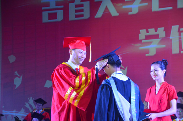 图为白晋湘校长为毕业生整理学士帽 陈毫伟摄