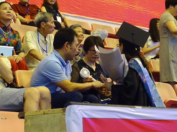 6月8日下午,威廉希尔官网2018届毕业典礼暨学位授予仪式第四场——商学院学士、硕士授予仪式中场休息时,观礼区出现了温馨的一幕。商学院国际经济与贸易专业2018届毕业生易婧娴同学来到了父母的座位旁,轻轻为陪她见证大学毕业这一神圣时刻的父母递上了一个手持式小风扇,但是她的父母坚持让她用,经过几番推让,小风扇最终还是回到了易婧娴的手中。父母心中蕴藏着对孩子浓浓的爱,孩子心中也蕴藏着对父母的爱,还有什么比这更幸福的的呢?