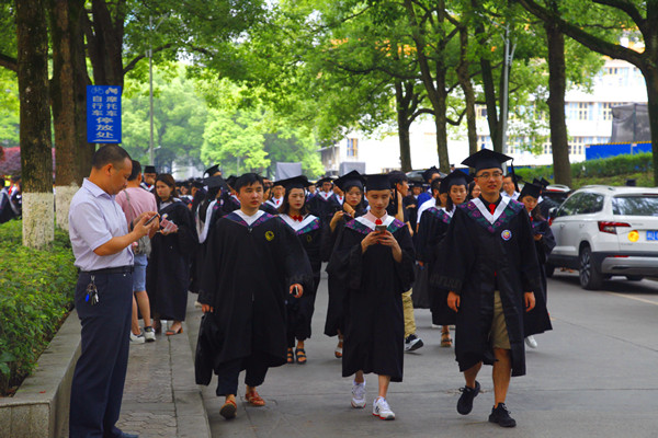 仲夏六月的这一天,校园里最靓丽的风景,不是风雨湖畔绽放的清荷,也不是林荫道旁挺拔的香樟,是漫布在校园各处、身披学士服、洋溢着青春笑脸参加毕业典礼的莘莘学子。