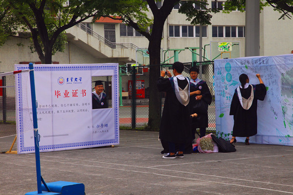 7日上午八点半,毕业生们在羽毛球场上排着队等待典礼开始,一群身着蓝色学士服的学长们吸引了我的视线,是数学与统计学院的硕士毕业生。他们准备在毕业生展板前拍照,其中两个学长就站位的问题,相视一笑,然后我听见“石头剪刀布”,就迅速站好了等待摄像师拍照。只是一转身的时间,他们一起看过的春季繁花、夏夜朗月、秋日落叶、深冬飘雪,入校时稚气的脸庞清晰在眼前,现在却要道一声珍重。