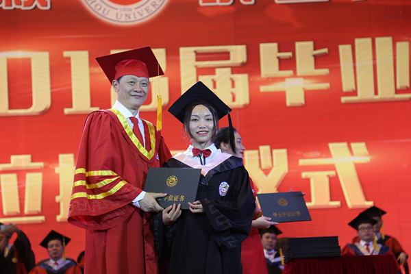 图为白晋湘校长为毕业生石慧琳颁授学位证书 见闻摄