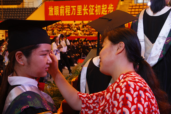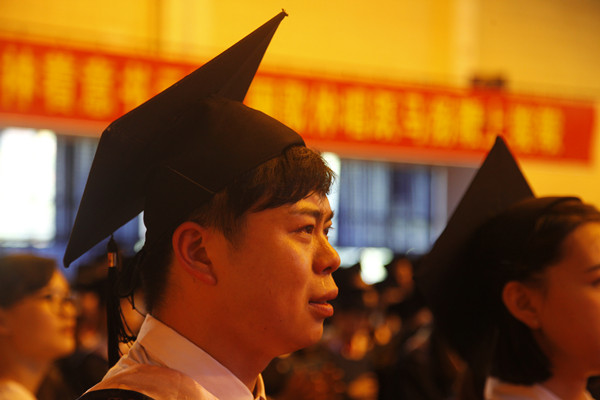 “武陵秀,千峰翠,我们风雨兼程,读书破万卷,铁肩担重任……”。6月7日下午的毕业典礼已经进入了最后的阶段,所有的毕业生一起合唱校歌,以此宣布自己大学生活的结束。吴松是其中特殊的一位,时不时的用袖子擦拭眼泪。