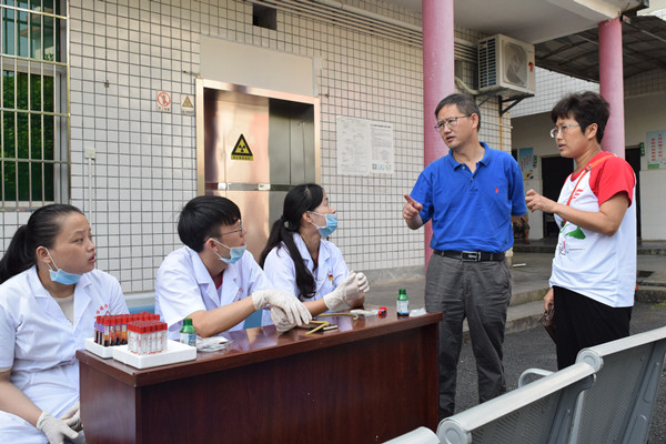 上午,龙先琼一行在石栏镇镇党委书记龙光平陪同下,看望了医学院在当地卫生院开展义诊服务的两支医疗健康服务团队。龙先琼现场接受志愿者的血压测试和推拿服务,并对大家的辛勤付出表示肯定,希望志愿者能保持充沛的精神,用所学所用致力于地方医疗卫生服务发展。随后,龙先琼一行来到志愿者的驻地。详细询问了住宿和饮食情况,对服务团的组织工作表示认可,叮嘱大家注意安全。