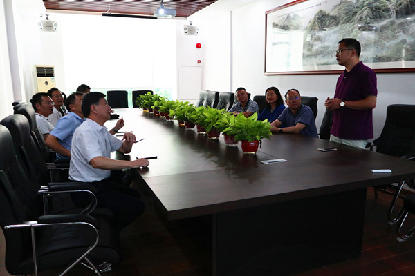 图为游俊、赵鹤平一行听取王锡光校友介绍其创办的广州青麦源餐饮管理有限公司情况