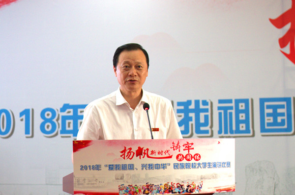 校长白晋湘致欢迎词。他代表学校对各位领导和来自18所民族院校的比赛选手、评委的到来表示热烈的欢迎。他简要介绍了学校的办学定位、学科建设、发展战略以及近年来取得的成绩等情况。白晋湘说,全国民族院校大学生演讲比赛为威廉希尔官网提供了一次向兄弟院校学习的难得机会。他表示,学校将以此为契机,发挥校园文化活动在大学生思想政治教育中的育人功能,认真学习和借鉴兄弟院校的经验做法;将进一步坚定文化自信,推动校园文化繁荣和发展,促进各民族学生相互交流、相互学习、相互促进,不断增强“五个认同”,铸牢中华民族共同体意识;将以习近平新时代中国特色社会主义思想和十九大精神为指导,认真贯彻落实全国宣传思想工作会议精神,全面加强民族团结进步教育,坚持服务地方的办学宗旨,充分发挥民族高校在区域经济社会发展中的积极作用,努力把英国威廉希尔唯一官网办得更好。