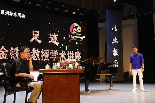 9月21日上午,金铁霖教授在音乐舞蹈学院实验剧场作了主题为《足迹》的学术讲座。讲座中,金铁霖教授深情地回顾了自己的音乐人生,重温了自己在个人成长和声乐教育的漫长道路上走过的一串串“足迹”。“我在小学的时候,喜欢体育,喜欢画画,喜欢文艺,当时也不知道搞声乐跟我有什么关系”,金铁霖教授回忆道,小学三年级时,喜欢踢皮球的他,用皮球换了同学的笛子,从此与音乐结缘。金铁霖的三舅爱好音乐。金铁霖小学毕业的时候,三舅把自己的吉他送给了他。于是金铁霖又开始自学弹吉他。初中毕业时,爱好体育比爱好音乐更多一点的金铁霖,鬼使神差地报考了沈阳音乐学院附中,虽然最后没有考上,但从此对声乐产生了兴趣,还经人推荐,跟一个俄罗斯老师学习了两个月。高中毕业后,他如愿考上了中央音乐学院,师从沈湘教授。在中央音乐学院,金铁霖受到了系统完善的声乐训练,为自己日后的声乐教育之路打下了坚实的基础。1965年,金铁霖大学毕业,阴差阳错被分到中央乐团任独唱演员。1981年调入中国音乐学院任教,后任院长。现为中国音乐学院名誉院长。在多年的民族声乐教学实践中,他逐渐摸索出了一条适合民族唱法的教学道路,一套独特的演唱方法。对此,金铁霖教授不无骄傲地说,“我的学生的唱法是不一样的”。被誉为 “造星”高手的金铁霖教授,培养出了彭丽媛、李谷一、董文华、汤灿、宋祖英、张也等一大批著名歌唱家。金铁霖教授特别提到了发现、培养宋祖英、张也这两位来自湖南的歌唱家的经过。讲座的下半场,金铁霖教授让他的四位博士研究生作了示范演唱,并逐一加以点评。这种生动的讲座形式,让观众更加直接地领略到金铁霖教授的声乐艺术教学风采。