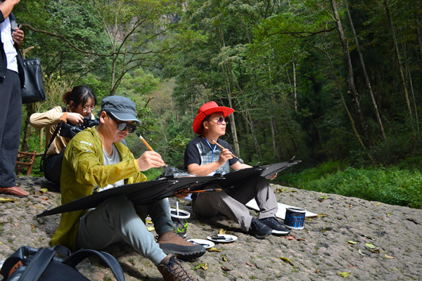 仪式结束后,30位受邀名家驱车前往张家界森林公园的金鞭溪进行写生,金鞭溪流域的溪流、台地、石墙、河谷、嶂谷皆为画家们着力表现的对象,从搜尽奇峰打草稿到胸有成竹地自如表现,每一步都让观者感受到艺术家的神思与艺术创作的无穷魅力。