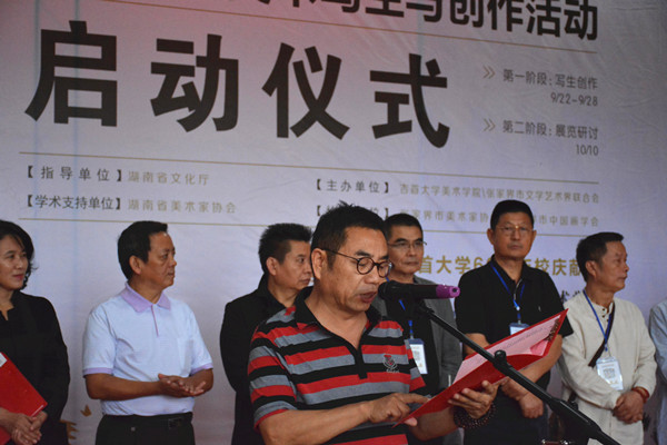 美术学院院长刘俊教授主持仪式并致欢迎辞,张家界市文学艺术界联合会党组书记、主席刘晓平先生致辞,美术学院党委书记王浓章宣布活动正式启动。市文联、市美术家协会、市书法家协会、红网、新湖南、政府公众信息网、张家界之窗、新张家界等相关负责人及英国威廉希尔唯一官网的老师、研究生、本科生参加了启动仪式。