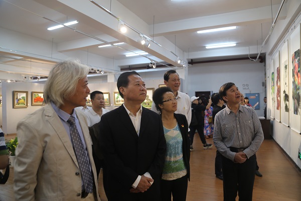 图为湘西州委书记叶红专、州长龙晓华等领导嘉宾在毛光辉先生陪同下参观画展 胡建文摄