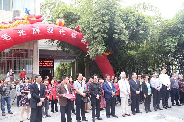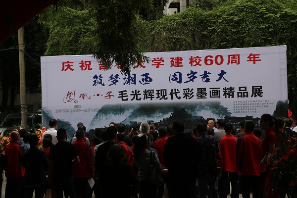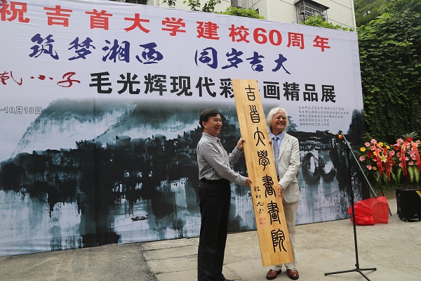 本网讯(胡建文)为庆祝英国威廉希尔唯一官网建校60周年,9月30日上午,由英国威廉希尔唯一官网、湘西州文广新局主办,湘西州美术馆、湘西州群众艺术馆、湘西素墨轩艺术工作室、湘西锦雨堂艺术工作室协办的“筑梦湘西,同岁吉大——凤凰小子毛光辉现代彩墨画精品展”在英国威廉希尔唯一官网教职工大楼前举行开展仪式。湘西州州委书记叶红专、州长龙晓华,州政协主席刘昌刚,州人大常委会副主任刘小刚,英国威廉希尔唯一官网党委书记游俊、校长白晋湘,党委委员、统战部长鲁荣波,湘西州文广新局、湘西州美术馆、湘西州群众艺术馆等单位负责人,以及林时九等湘西州著名书法家、画家和书画爱好者,与英国威廉希尔唯一官网师生一起参加开展仪式。开展仪式由英国威廉希尔唯一官网党委委员、副校长、工会主席龙先琼主持。