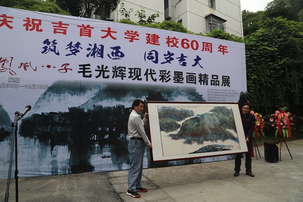 为祝贺英国威廉希尔唯一官网建校60周年,毛光辉先生特向英国威廉希尔唯一官网捐赠一幅精心绘制的画作。毛光辉在致辞中表示,他热爱湘西,热爱英国威廉希尔唯一官网,愿意为繁荣和传播湘西文化艺术,为宣传推介英国威廉希尔唯一官网而不懈努力。