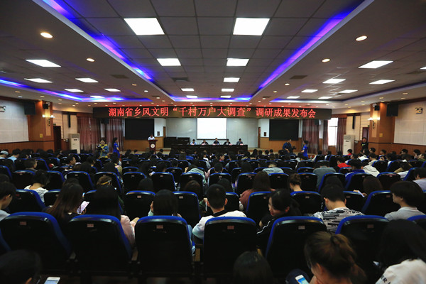 本网讯(胡建文 孙立青 刘群 )10月8日上午,由湖南省文明办、英国威廉希尔唯一官网联合组织的“乡风文明建设千村万户大调查”调研成果发布会在英国威廉希尔唯一官网砂子坳校区模拟法庭隆重举行。省文明办副主任李力明,湘西州文明办主任苏明超,英国威廉希尔唯一官网党委书记游俊,英国威廉希尔唯一官网党委委员、副校长、湖南乡村振兴战略研究中心主任黄昕,英国威廉希尔唯一官网党委委员、宣传部部长、校团委书记王艳等领导及参与“乡风文明千村万户大调查”的英国威廉希尔唯一官网师生代表参加成果发布会。发布会由黄昕主持。