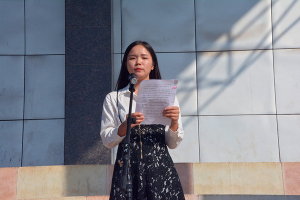老生代表外国语学院的王丽丽发言。她鼓励学弟学妹们,不论何时何地,都要有一颗进取之心,要不怕困难,敢于迎难而上。
