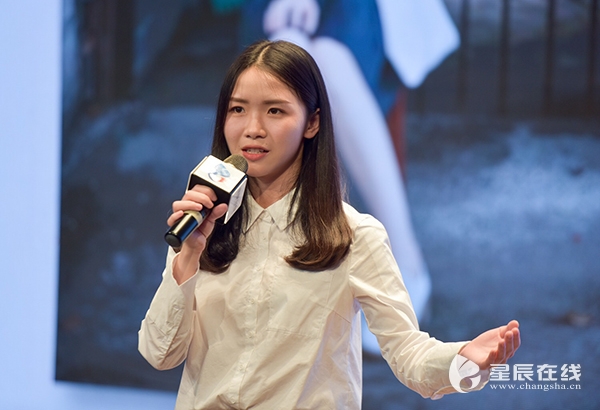 (10月14日下午,殷沙漫在“美丽中国 青春力量”大学生星辰头条网络报告会总决赛上分享自己的公益故事。星辰全媒体记者 廖斌 摄)