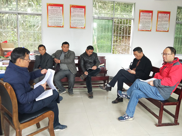 图为赵鹤平书记一行听取驻村工作队队长李启贵的情况汇报