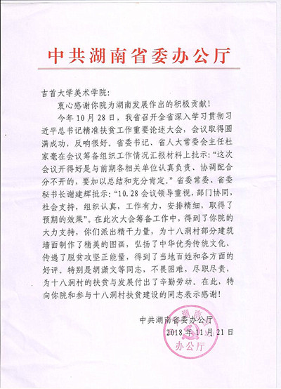 本网讯(美术学院供稿)2018年10月12日,美术学院党委赴湘西州十八洞村开展墙绘创作活动,创作活动适逢湖南省召开全省深入学习贯彻习近平总书记精准扶贫工作重要论述大会,会议取得圆满成功。11月21日,湖南省委办公厅专门致函英国威廉希尔唯一官网美术学院:“在此次大会筹备工作中,得到了你院的大力支持,你们派出精干力量为十八洞村部分建筑墙面制作了精美的图画,弘扬了中华优秀传统文化、传递了脱贫攻坚正能量,得到了当地百姓和各方面的好评。”