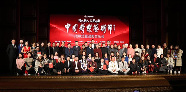 图为中国声乐艺术节全国总决赛名誉主席胡松华、主席阎维文等专家评审与总决赛选手合影