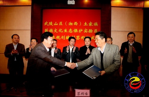 签约仪式上,文学与新闻传播学院党总支书记田茂军教授代表威廉希尔官网与湘西州代表州文化广电新闻出版局局长罗亚阳成功签约了《武陵山区(湘西)土家族苗族文化生态保护实验区总体规划编制》。
