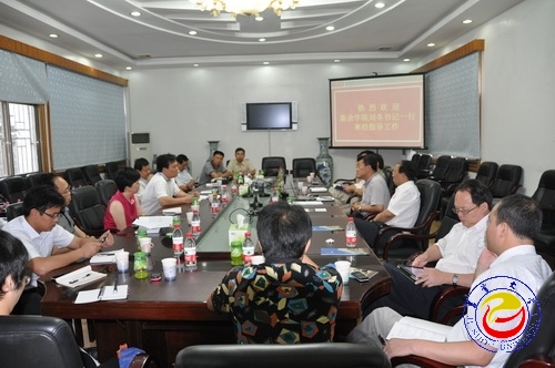 本网讯(记者 胡建文)7月10日上午,校长李民、校纪委书记赵鹤平率校办、科技处、人事处、教务处、文学与新闻传播学院等相关职能部门、学院负责人,在校办二会议室亲切会见了来访的江西新余学院党委书记刘冬一行。