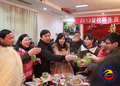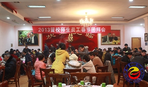 本网讯( 吴洪波 王光昊 )2月9日中午,威廉希尔官网在科技交流中心二楼餐厅举行2013年春节团拜会。校党委书记游俊,副校长李克纲、龙先琼以及校办、宣传部、学工部、保卫处、后勤产业处等部门负责人及相关学院负责人与100余名春节期间值班的教职员工以及寒假留校的学生共进团年宴。