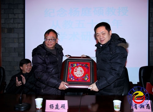 肖湘愚代表学校向杨庭硕赠送了纪念品。