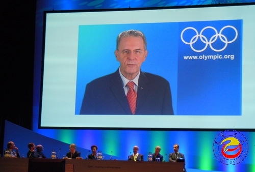 图为 国际奥委会主席罗格先生为大会致贺辞