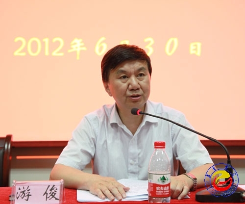 游俊在讲话中向受到表彰的先进基层党组织和优秀共产党员表示祝贺,希望他们珍惜荣誉,再创佳绩。游俊从办学理念和思路、办学实力和合力、办学特色等方面对学校的创先争优活动进行了总结和回顾。他还就党建和思想政治工作提出了几点要求,一要把握发展大局,切实责任感和使命感;二要创新工作思路,努力提高科学化水平;三要把握工作重点,切实增强工作实效;四要加强制度建设,推动创先争优常态化、长效化;五要加强各级领导班子思想作风建设。游俊还强调,各学院要加强对暑期留校同学的管理;加强对网络媒体的管理,收集舆论信息,加强监管;做好学生的安全稳定教育工作。