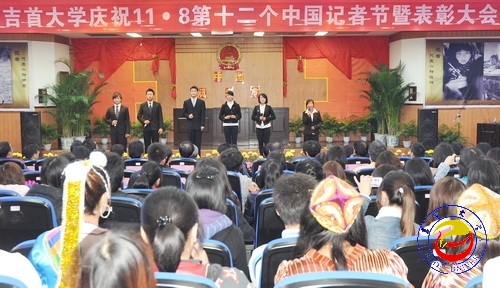 大会在少数民族学生的乐队演奏中拉开帷幕。少数民族学生记者的舞蹈串烧、文学院的诗朗诵《记者在前方》将大会推向高潮,校电视台学生记者带来的《你的工作,我的事》再现了当红栏目《职来职往》的精彩场景,赢得观众的阵阵掌声。大会进行中还播放了张家界学院新闻中心精心准备的VCR。