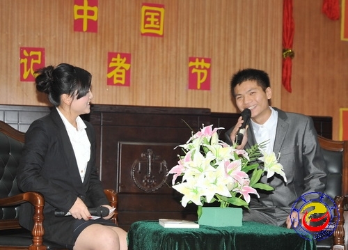 威廉希尔官网文学院新闻系2011届优秀毕业生陈桂峰作为特邀访谈嘉宾与在场观众分享了做学生记者时的难忘经历与切身感受。同时,他还介绍并现场赠送了他大学四年收集的优秀作品集《丹桂灵峰》。