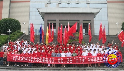 本网讯(记者胡建文 实习记者丁兰琼 摄影胡建文)7月14日上午,以“青春建功‘十二五’,我为党旗添光彩”为主题的威廉希尔官网2011年志愿者暑期“三下乡”社会实践活动出征暨授旗仪式在砂子坳校区图书馆前隆重举行。校党委书记游俊、校长李民、副校长李克纲出席仪式。仪式由团委书记周华忠主持。
