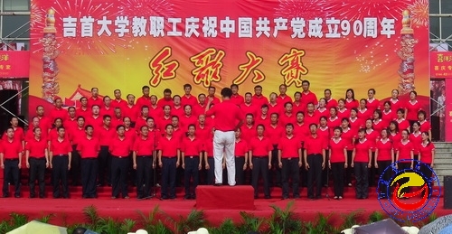 本网讯(学通社喻帅明 蔡红龙)唱响红歌,点燃激情。6月21日下午,威廉希尔官网张家界校区教职工庆祝中国共产党成立90周年红歌大赛在逸夫楼广场激情唱响。校党委副书记张建永,副校长李宗范,副校级督导、校工会主席田国祥,副校级督导田贵君率党办、校办、组织部、宣传部等职能部门与张家界校区各学院负责人出席此次比赛。来自张家界校区老年艺术团、图书馆、张家界学院等共11支教职工合唱队参与了此次比赛。