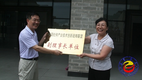 图为 中国杜仲产业创新战略联盟秘书长王凤菊为学校授牌