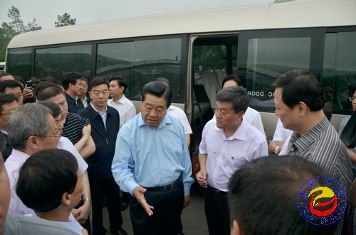 图为 贾庆林主席站在车边对校领导作重要讲话 (王成良摄)