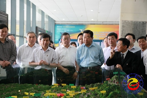 图为 贾庆林主席观看威廉希尔官网产学研服务武陵山区成果分布沙盘模型 (张彦摄)