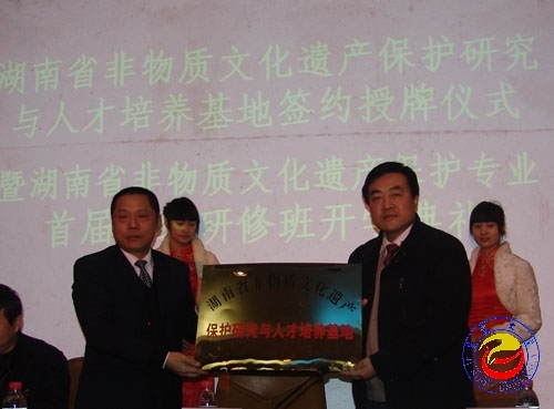 随后,孟庆善与李民分别代表省文化厅和学校签约,李民从孟庆善手中接过“湖南省非物质文化遗产保护研究与人才培养基地”牌匾。