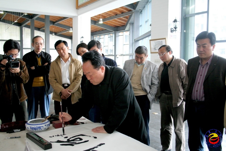 参观各个展厅过程中,游俊详细为来宾介绍了黄永玉的为人及其作品特色。每到一副书法作品前袁彦鹏都要细细品读,了解创作的相关情况,当看完书法作品“三十而立,四十而不惑,五十而知天命,六十而耳顺,七十随心所欲不逾矩,八十脸皮太厚刀枪不入,孔老二黄老大补句末”时忍俊不禁,称赞黄老先生的艺术修养高,为人豪气。同行的领导也不停地称赞博物馆独具特色,有很高的艺术和收藏价值。参观完博物馆后,袁彦鹏、邵国树应邀在嘉宾留言册上分别题字“大艺成师”和“艺”表示纪念。