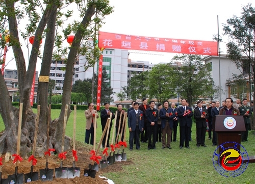 校党委书记游俊在仪式上致答谢辞。他首先代表校党委、行政和两万多名师生员工向花垣县表示感谢,向多年来一直关心和帮助学校发展的各界领导、朋友表示感谢。他说,花垣县此次捐赠是对我州教育事业的大力支持,让大家深深感受到花垣县校友们心系母校的恩情。他还详细解说了这棵有着五个枝桠的紫薇树的寓意,它诉说着威廉希尔官网五十周年发展历程,展示了威廉希尔官网五个校区的成长历史,预演着学校今后发展的红火,象征着学校与花垣县的合作与友谊,他相信这棵紫薇树必将成为学校又一道美丽的风景,它将和吉大的明天一样枝繁叶茂。他还热情地期盼校友们能在五十周年校庆时,能赶回母校共商学校发展大计。