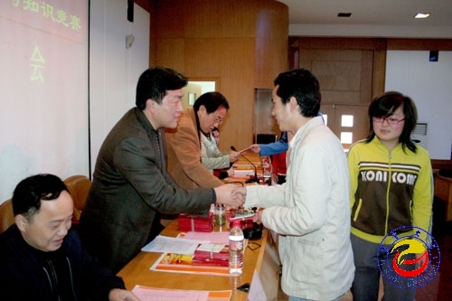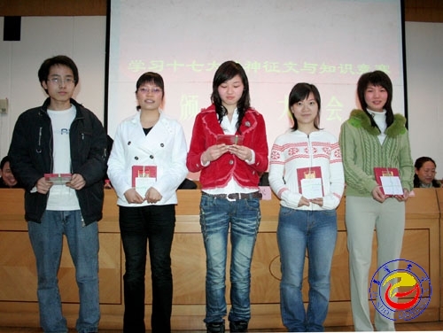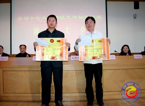 会上,吕学芳对获奖单位及个人表示了热烈的祝贺,并回顾了十七大精神征文比赛和知识竞赛的主要情况。申绪湘宣布了表彰决定,她希望获奖的单位和个人能够再接再厉,宣传典型、弘扬正气,为学校的发展贡献力量。07级研究生冯叶代表获奖者发言,她号召全体学生珍惜大学时光,提高创新能力和实践能力,培养科学精神与创新精神,用实际行动为母校争光。随后,与会领导为获奖个人和集体颁发了获奖证书以及奖金。