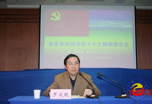 罗成琰书记表示很高兴来到吉大与在座各位共同学习十七大精神。他充分肯定了吉大在教学、科研及其他方面取得的长足发展,社会影响力和关注度都得到了很大提高,这一切预示了吉大的未来会更美好。