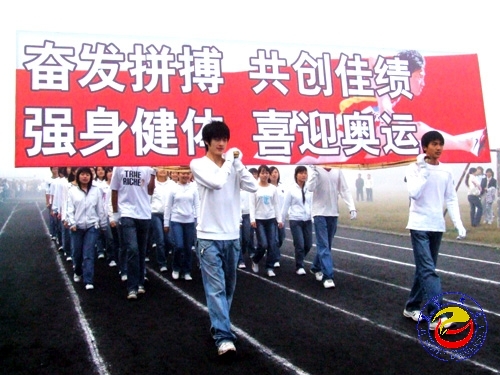 上午八时三十分,校体育运动委员会副主任、体育科学学院院长刘少英宣布开幕式开始。“弘扬奥运精神,构建和谐校园”的巨大标语随着国旗、校旗进入会场,气球、花束、彩旗把运动场装扮成欢乐的海洋。国旗队、校旗队、彩旗队迈着矫健的步伐第一个进入运动场,外国语学院、旅游学院、美术学院、张家界学院等代表队方阵整齐有序、特色鲜明地分别进入会场。